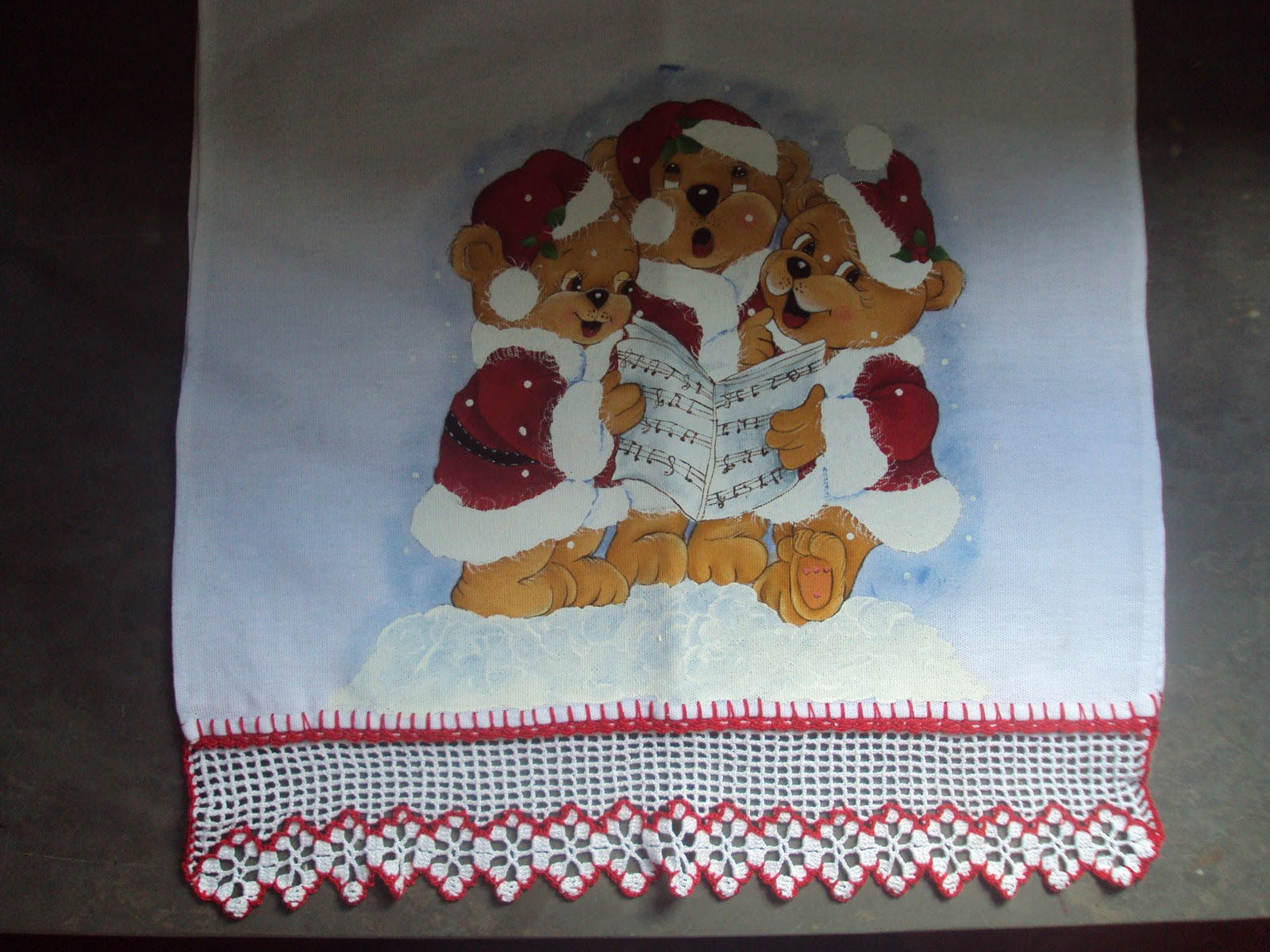 BOM DIA AMIGAS,mais um trabalhinho que gostei de fazer,só saiu torto na foto,mas da pra ver. O barrado de crochê foi tirado do blog Solange pinturas e artes da amiga solange jaroszewski,amei fazer pois é fácil,visite ela,vocês vão gostar dos trabalhos maravilhosos que ela faz.Há esqueci de dizer que os barradinhos dos ursinhos cantores e do boneco de neve foi feito pela minha filhota Ludmilla,os créditos são dela.Uma boa semana produtiva pra vocês.Beijão.