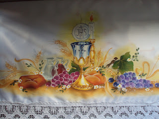 Esta é uma toalha de altar pintada pelo Rafael,meu filho.Feita para uma primeira Eucaristia na comunidade São José Operário aqui em Montes Claros/MG.Motivos religiosos é uma paixão dele.Espero que vocês gostem.Esse risco foi ele que fez,caso prescisem de motivos religiosos bastam deixar um recadinho falando como que vocês querem e o e-mail.Que então ele faz e enviamos.Até a próxima postagem e obrigada pelo carinho!!!
