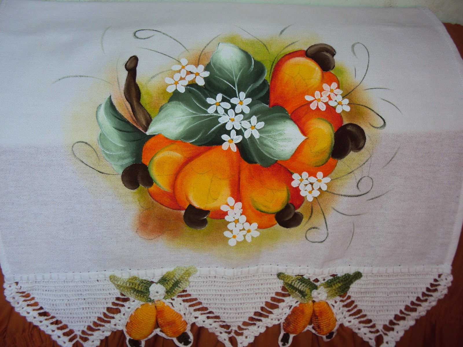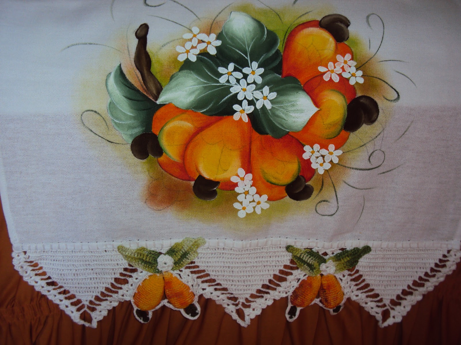 Olá meninas,obrigada pelo comentário no periodo do meu aniversário.Hoje vim mostrar este pano de prato que amei fazer,o barrado eu tirei de uma revista que tem os trabalhos maravilhosos de Neusa Frasquett,os caju de croche é recheado de metalasse,teci com a linha amarelo claro e depois pintei os caju com outras cores, a cliente gostou e eu tambem.Beijos amigas.